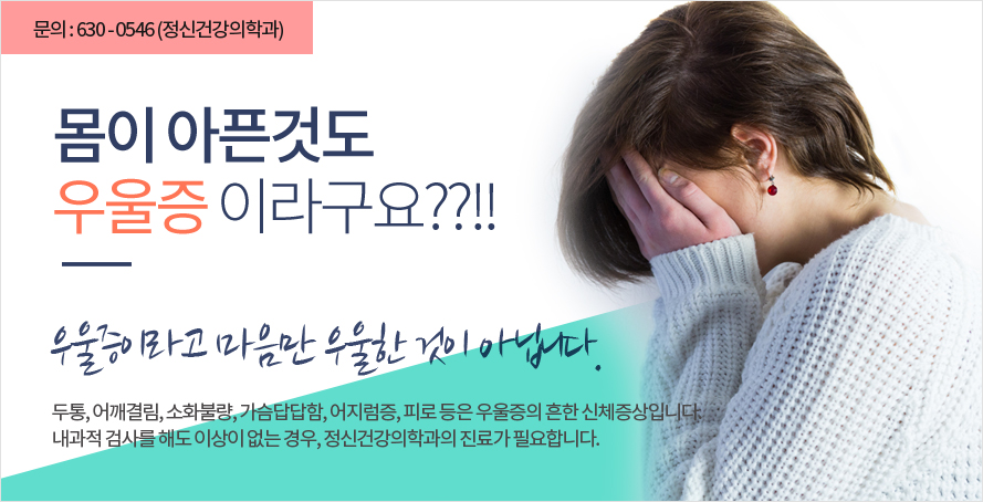 그러나 본인 스스로 우울감을 느끼지 못하는 경우도 많으며, 짜증이나 분노폭발로 표현되는 수도 있습니다. 또한 과식, 과수면 등의 비전형적 양상이나 여기 저기 몸이 아픈 신체적 증상으로 나타나는 경우도 많기 때문에, 내과나 다른 과를 전전하는 경우도 많이 있습니다. 청소년의 경우 비행행동이나 반항으로 표현되기도 합니다. 우울증이 심할 경우 자살이라는 극단적인 결정을 하는 경우도 있습니다. 이처럼 다양한 얼굴을 가진 우울증은 정신건강의학과 전문의와 상의해서 조기에 치료할 경우 큰 도움을 얻을 수 있습니다.